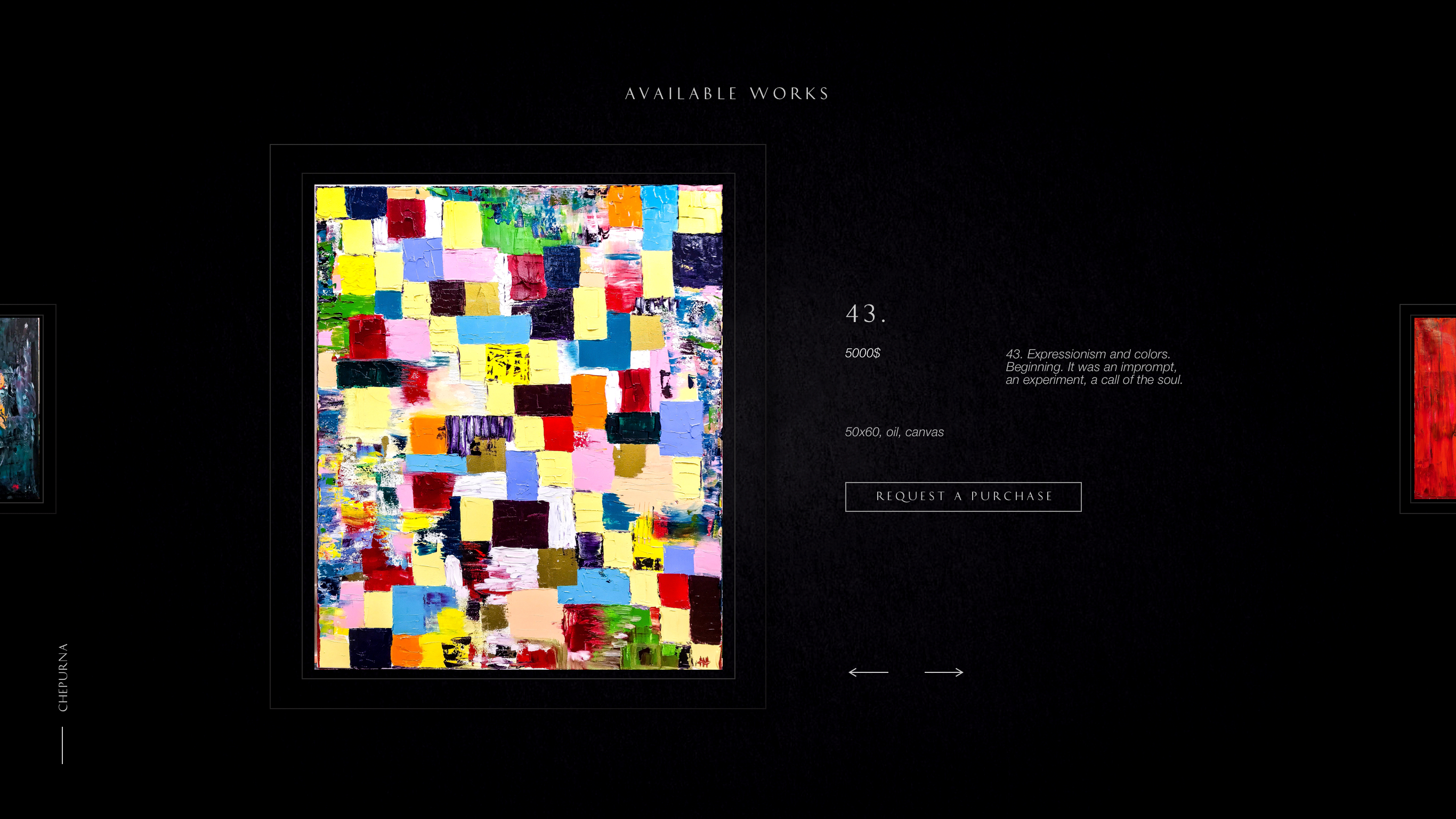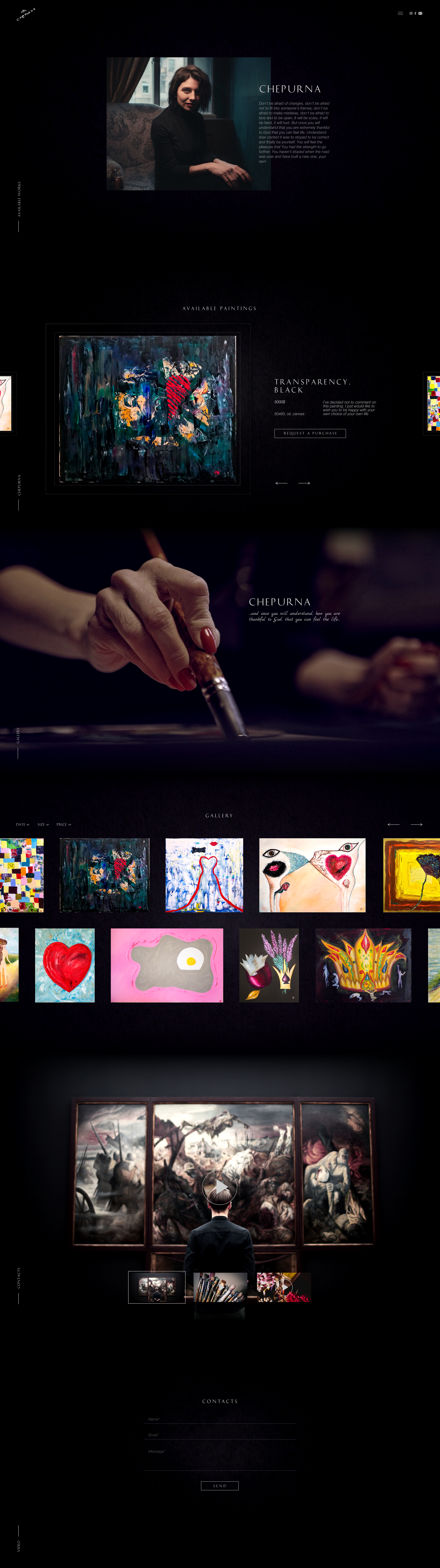 В цей раз нашим клієнтом стала мила дівчина-художник. Сайт представляє її з професіональної сторони, перегукуючись з її творчістью, він ж являється онлайн-гелереєю і дає можливість без зайвих зусиль зв'язатись з автором з приводу співпраці або придбання картин. Робота була достатньо важкою. Прийшлось двічі бріфувати Євгенію, щоб ми змогли реалізувати проект, відповідний до тонкого відчуття стилю професіональної художниці. В результаті дизайн сайту занурює користувача в атмосферу особистої галереї-виставки, а також передає частину внутрішнього світу Chepurna.
