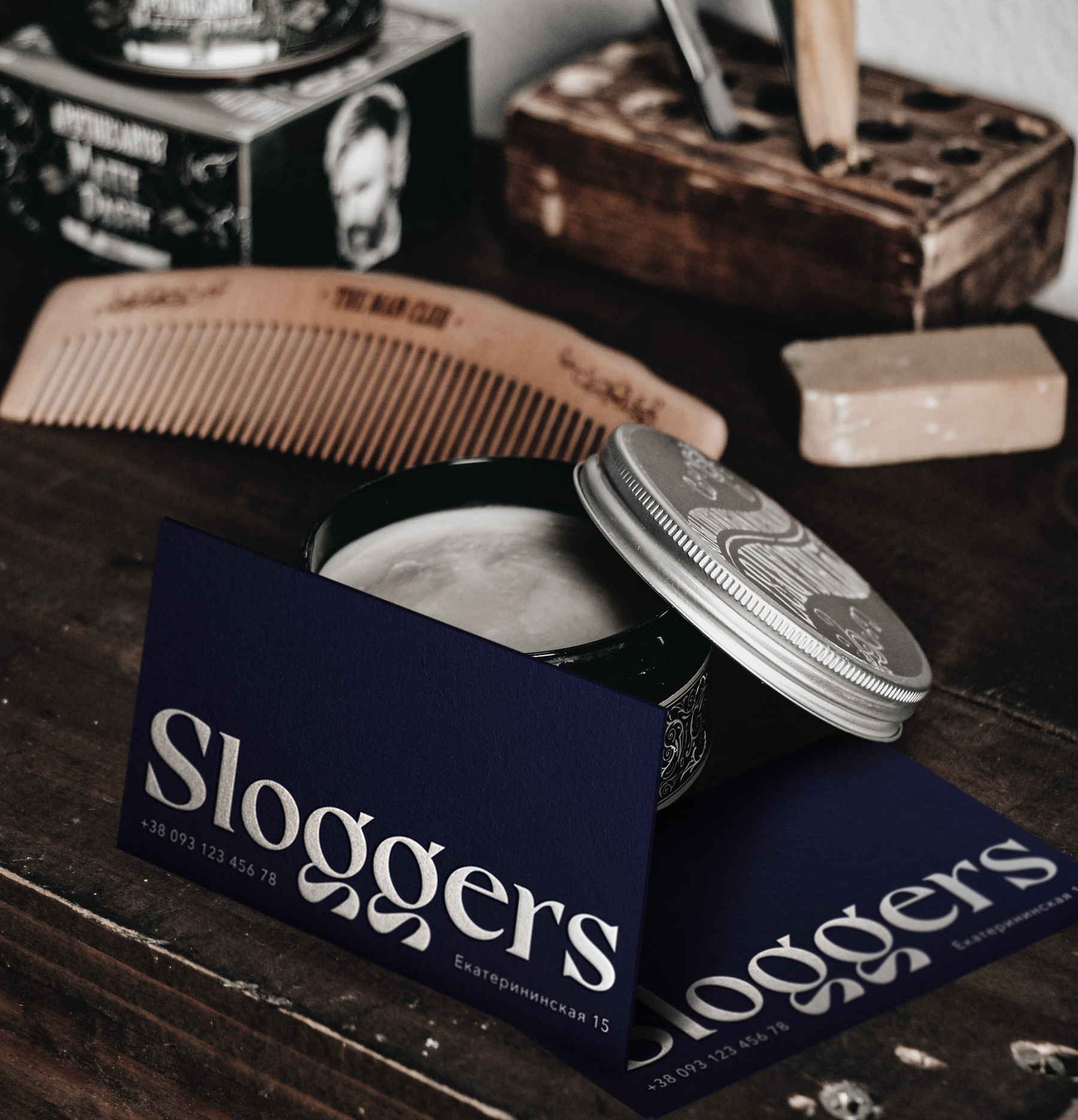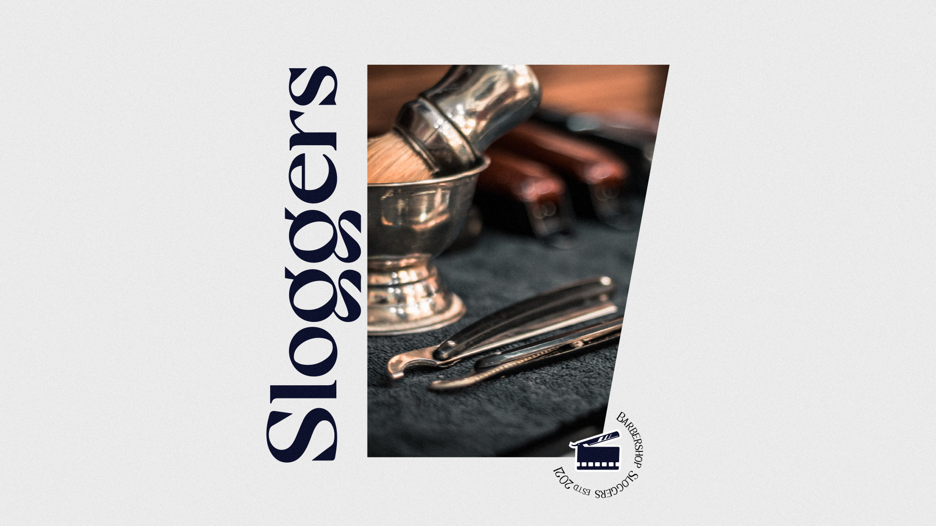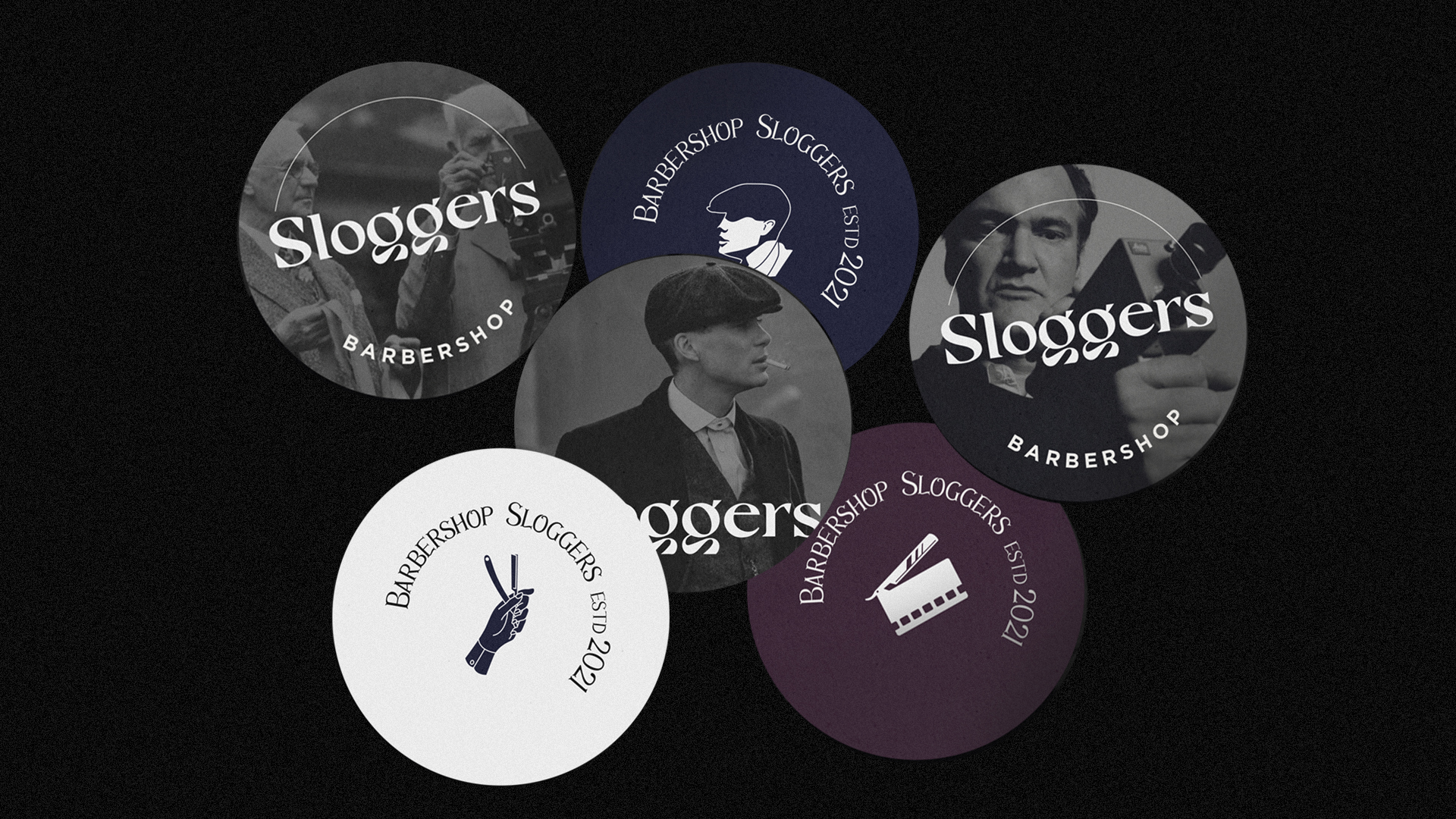 Sloggers — це кіноперукарня. Ми розробили назву, натхненну серіалом Peaky Blinders, Sloggers - історичну назву для асоціацій, представлених у цьому кинотворі. У брендингу ми використовували кадри з фільмів і фотографії відомих режисерів і акторів. Ця техніка чудово підходить для початку розмови з клієнтом перукарні про кінематограф.